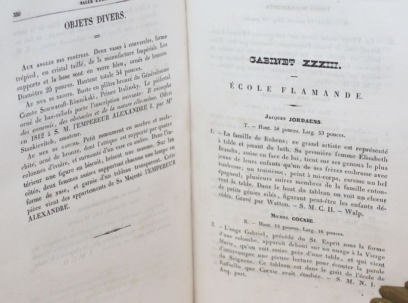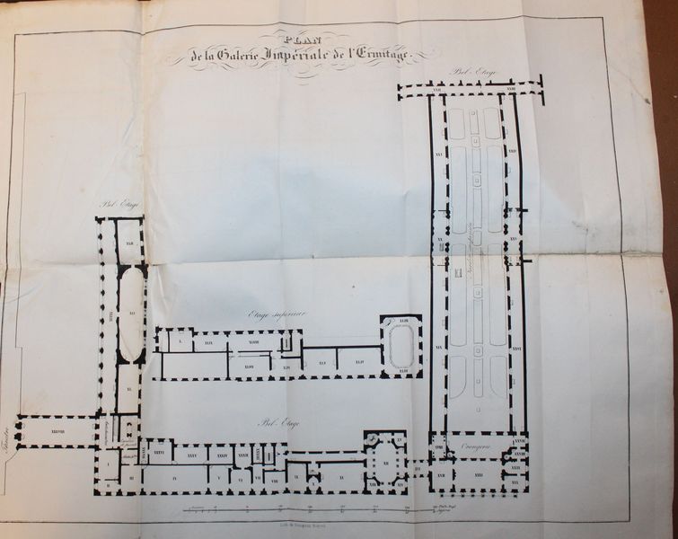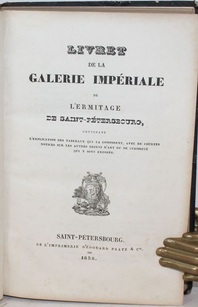 Le Musée d'État de l'Ermitage (en russe Gosudarstvenny Ermitazh) fut fondé en 1764 par Catherine II, qui voulut symboliser par une collection prestigieuse la grandeur de la Russie. Dans un souci de rapprochement avec l'Europe, l'impératrice avait acquis des collections entières (Gotzkowski, 1764 ; Brühl, 1769 ; Crozat, 1772, etc.). Elle fit construire de 1764 à 1775 le pavillon du Petit Ermitage, attenant au palais d'Hiver, résidence des tsars de Russie (érigé entre 1754 et 1762), afin d'y exposer ses tableaux, instaurant ainsi une galerie privée réservée à l'usage de la cour. Le palais d'Hiver, incendié en 1837, fut reconstruit sous Nicolas Ier, de 1840 à 1852 ; le musée proprement dit, épargné par les flammes, ouvrit ses portes au public à la fin des travaux. Après la révolution d'Octobre 1917, les collections impériales devinrent la propriété de l'État. Le complexe de l'Ermitage réunit aujourd'hui cinq édifices reliés entre eux, comprenant le palais d'Hiver, le Petit Ermitage, l'Ancien Ermitage (dit Grand Ermitage, construit de 1771 à 1787), le Nouvel Ermitage (inauguré en 1852) et le théâtre (édifié de 1783 à 1787). Le premier guide officiel et détaillé des collections paraît à Saint-Pétersbourg en 1838: ce Livret de la Galerie impériale de l’Ermitage de Saint-Pétersbourg nous offre un état des lieux avant travaux. Il nous permet d’appréhender à la fois l’apport de la France à la constitution et à la mise en valeur des collections durant la première période de son histoire et, complété par l’étude de divers documents d’archives conservés au musée d’État de l’Ermitage, il nous éclaire plus précisément sur les motivations esthétiques, voire politiques, des grandes acquisitions réalisées en France au début du XIXe siècle. Des motivations qui transparaissent jusque dans l’agencement des salles d’exposition de ces derniers achats, dans cet Ermitage impérial d’avant sa reconstruction. Le Livret de 1838 est édité sous l’autorité du directeur de la galerie de l’Ermitage, François Xavier Labensky (1769-1850), qui commença sa carrière en ces lieux sous Paul Ier. Il propose principalement une visite détaillée, salle par salle, des galeries, avec des descriptions complètes de chaque tableau. Le catalogue s'ouvre sur un bref aperçu historique et comprend un index, témoignant de sa rigueur scientifique. On remarque notamment une grande carte dépliante et un tableau en fin d'ouvrage présentant le nombre d'artistes et de tableaux, classés par école nationale et détaillant les acquisitions réalisées par chacun des quatre monarques (Catherine la Grande, Paul Ier, Alexandre Ier et Nicolas Ier) qui ont enrichi la collection. Ce tableau révèle que sur les 1 692 tableaux que comptait l'Ermitage en 1838, une part importante (1 385) a été acquise par Catherine la Grande. |