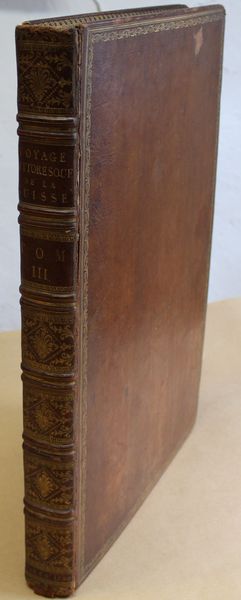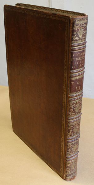 | Observations : | Tome III (sur 4) de cet ouvrage monumental, célèbre pour la qualité et l'abondance de ses planches. L'ouvrage complet doit comporter 2 tomes reliés parfois en 3, 4 ou 5 volumes avec les planches séparées, avec 430 Estampes sous 278 numéros représentant de magnifiques vues, cartes et portraits hors texte gravés par Née et Masquelier d'après Pérignon, Le Barbier, etc. Notre volume contient la première partie du Tome deuxième, celui-ci est tomé III au dos, il manque donc le Tome I (relié en 2 volumes, 366 - LXVI pp.) et la deuxième partie du Tome II (p. 363 à 578). Premier tirage de l'un des plus beaux livres illustrés sur la Suisse. L'ouvrage n'est pas moins intéressant par son texte : rédigé à la suite d'un véritable travail de collaboration entre spécialistes (Besson pour la minéralogie, Zurlauben pour l'histoire et le droit, Quétant, etc.), il offre pour l'époque la meilleure description des Cantons suisses, et aussi la plus renseignée en termes d'histoire et d'institutions. Sommaire : Etat des sciences et des arts - Moeurs des Suisses (Etats aristocratiques, démocratiques, helvétiques...) - Topographie , ( Canton de Zurich, Berne, Lucerne, Uri, Schweitz, Underwalden, Zoug, Glaris, Bâle, Fribourg ). Bel exemplaire en veau de l'époque. Provenance : De la bibliothèque E. H. Green Hinxton Cambridgeshire, avec ex-libris contrecollé et manuscrit. | |||||