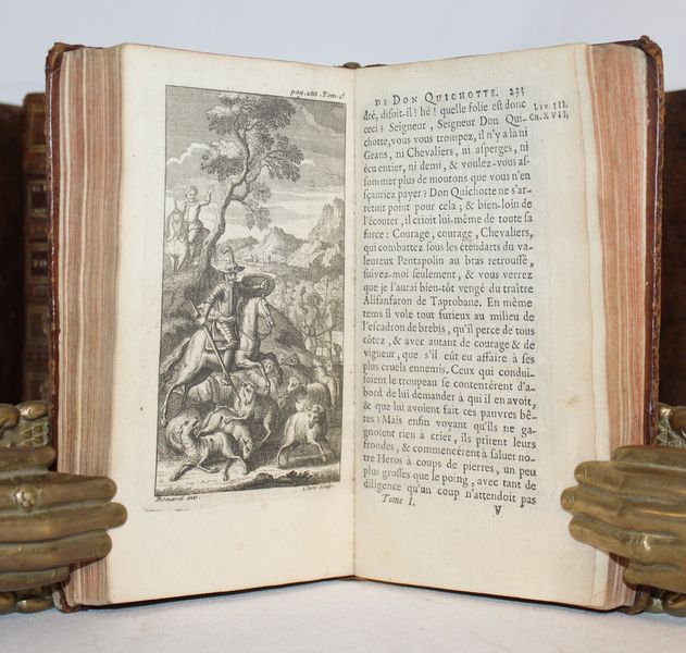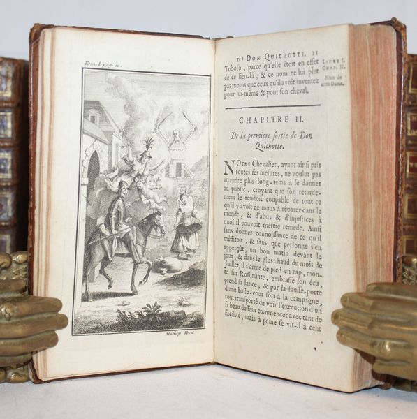Huit volumes in-12. Gravures par Bonard, Crepy le fils, Humblot & Mathey dont certaines d'après Charles-Antoine Coypel. Illustré d'un frontispice par Humblot et gravé par Laurent Cars et de 37 figures sur 39 (sans les fig. T.III p. 113 et T. IV p. 182), plusieurs des gravures se trouvent avant la lettre et 2 frontispices et 15 figures gravées par Clouzier pour les Nouvelles avantures. |