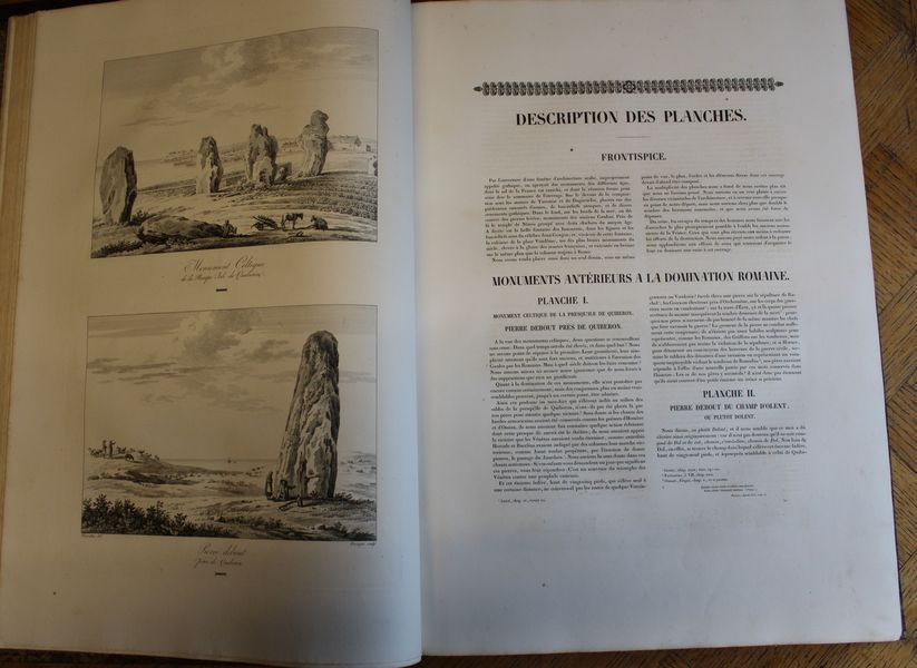 Observations : Rare édition originale magnifiquement illustrée. L'illustration se compose d'un frontispice et de 259 planches hors texte, dont 23 à double page, contenant plus de 300 sujets, lithographiées par Baltard, Réville, Malbeste, d'après les dessins de Constant Bourgeois, Nicolas Chapuy et Bance, qui avaient consacré plusieurs années à parcourir la France et qui devinrent, après 1820, les artisans des grands recueils lithographiques. «L'héritage de tous les siècles» se trouve ici rassemblé, l'auteur voulant montrer que la France est, de toutes les contrées, la plus riche en monuments de tous les âges. Tiré de l'avant propos Dans le premier volume, nous avons décrit la plus grande partie des monuments celtiques et romains... Second volume doit contenir la description des édifices civils et religieux élevés sous le règne de nos Rois...Nous y avons signalés trois genres d'architecture.. Style roman ou à plein-cintre, appelé indistinctment saxon ou lombard ; le style ogivique, dit improprment gothique ou arabesque, et le style de la renaissance. Précieuse édition de cet important ouvrage illustrant de la plus belle des manières les monuments des villes de Sens, Joigny, Vézelay, Cavaillon, Vienne, Fréjus, Aix, Reims, Avignon, Bordeaux, Toulouse, Autun, Toul, Lyon, Chartres, Paris, Tours… (la planche 184 se trouve sur la planche 180)