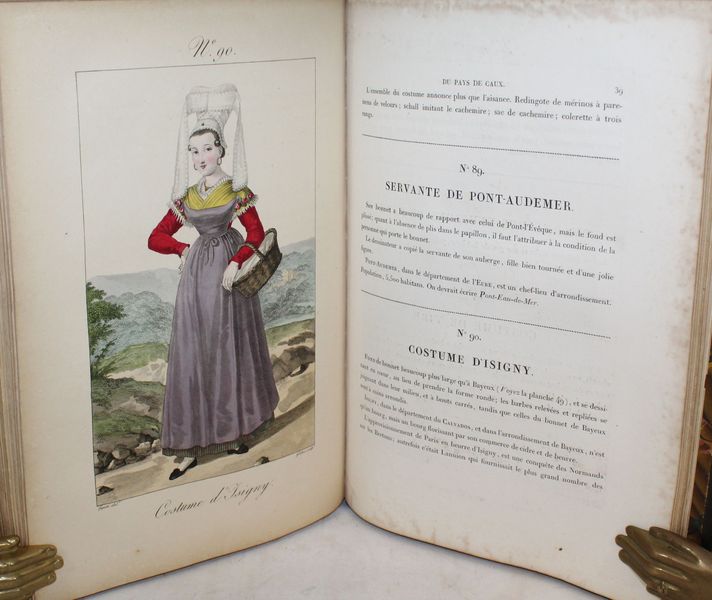 | Observations : | Magnifiques illustrations en couleurs de costumes normands principalement d'après Louis-Marie Lanté (quelques-unes d'après Pécheux), et rehaussées de couleurs. Pécheux, peintre de grand renom, spécialiste de fresques à l'italienne (il était né à Rome) travaillait en France depuis la campagne d'Italie et dirigeait un atelier de peintres italiens ambulants. En 1811, la fabrique de l'église d'Yvetot s'adresse à lui pour décorer la chapelle de la Vierge. La même année, il décore la coupole de Saint-Romain à Rouen. Il est aussi appelé à Limpiville, à Fécamp et au Havre. Les dimanches et jours de fête, il côtoie des Cauchoises parées de coiffes originales et il les dessine avant de rentrer à Paris. La Mésangère, qui dirige dans la capitale le Journal des Dames et des Modes, envoie à son tour un artiste chargé de faire un reportage plus complet: c'est Lanté qui, en 1819, va séjourner dans le Caux puis dans les autres parties de la province, fréquentant surtout les foires et les ports de la côte, pour fixer sur le papier les particularités du costume. Premier tirage daté 1827 avec les 23 feuillets d'explication des planches. Edition originale en bon état de fraîcheur, bien complète des 105 planches et du texte. | |||||