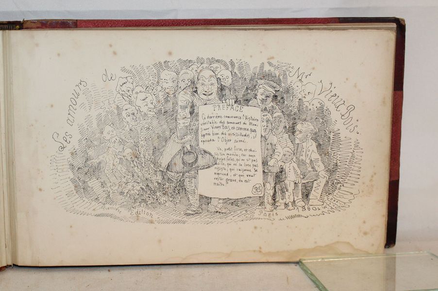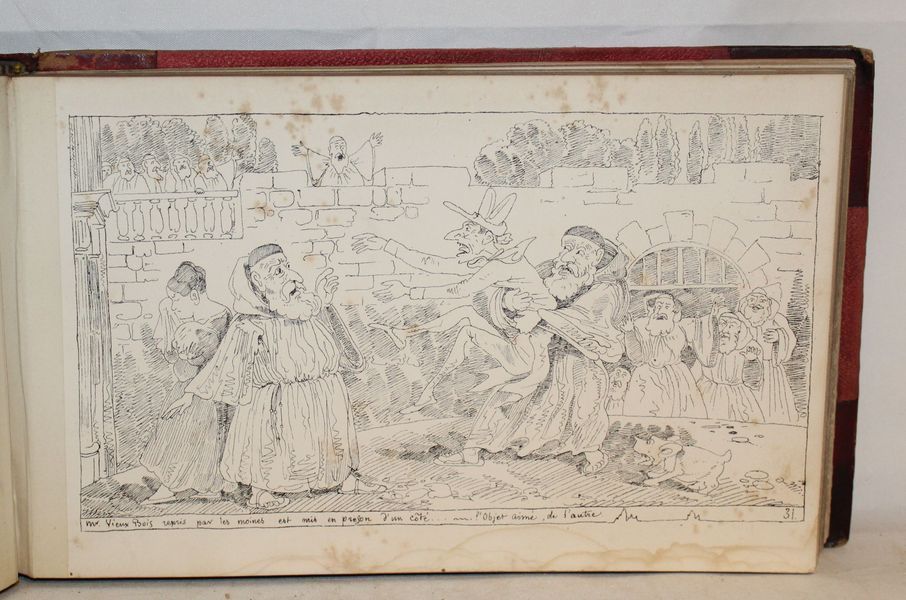 | Observations : | Livre illustré par Topffer. Complet de ses planches. IL est aujourd'hui considéré comme la première bande dessinée connue. Dessiné en 1827 mais autographié et publié en 1837. Sur la page de titre on peut lire cette préface: « Ci-derrière commence l’histoire de monsieur VieuxBois, et comme quoi après bien des vicissitudes, il épouse l’Objet aimé. Va, petit livre, et choisis ton monde ; car aux choses folles qui ne rit pas baille ; qui ne se livre pas résiste ; qui raisonne se méprend, et qui veut rester grave, en est maître. » | |||||