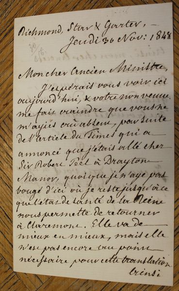 | Observations : | Dans cette lettre Louis Philippe en exil regrette d'avoir raté la visite de son cher ancien ministre et attend que la santé de la reine s'améliore pour retourner à Claremont House, manoir appartenant au roi Léopold Ier de Belgique, gendre de l'ancien roi des Français. Le roi déchu devait y mourir le 26 août 1850. Louis Philippe logeat dans cet hôtel Star et Garter avec sa famille pendant 6 mois en 1848-49 où il fut visité par la reine Victoria et par Guizot qui se trouvait également en Angleterre à la date de notre lettre. Napoléon III fut élu Président de la République quelques jours après cette lettre, le 10 décembre 1848. | |||||