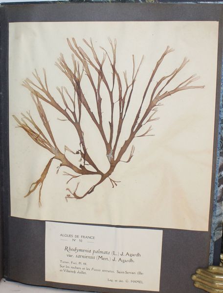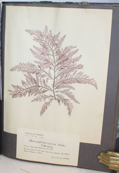 | Observations : | 4 exemplaires en bibliothèques publiques, 3 en France dont le Muséum d'histoire naturelle de Paris et un en Grèce, tous incomplets de la 5ème partie. Il s'agit donc du seul exemplaire complet connu. Ces échanges entre botanistes de collections de plantes desséchées encore appelées exsiccata remontent à la seconde moitié du XVIIe siècle. A la fin de la première guerre mondiale, un renouveau d’activité dans les recherches phycologiques se manifesta en France, grâce à l’initiative de deux jeunes phycologues du laboratoire de Cryptogamie du Muséum, P. Allorge (1891-1944) et G. Hamel (1883-1944) qui, en 1924, fondèrent la Revue algologique. Cette revue devait paraître jusqu’en 1941 et elle publia, outre de nombreux travaux phycologiques français, ceux de plusieurs confrères étrangers. P. Allorge, pliytosociologue et bryologue en meme temps que phycologue, s’intéressa particulièrement à l’écologie des algues d’eau douce et notamment des Desmidiées. Au cours de ses multiples voyages en France, il découvrit de nombreuses espèces nouvelles pour ce pays. Il a été le premier à faire intervenir les Algues dans la caractérisation des groupements phvtosociologiques. Gontran Georges Henri Hamel (1883-1944) algologue français, il exerçait au Muséum d’Histoire Naturelle de Paris et au laboratoire de cryptogamie. Pour les Algues marines, G. Hamel fit paraître, par fascicules, les Chlorophycées des Côtes françaises et quelques fascicules des Floridées de France, comprenant en particulier une monographie des genres Acrochaetium et Rhodochorton. Mais son œuvre la plus importante est constituée par les Phéophycées de France qui, achevée en 1939, est un modèle de flore pliycologique, riche en descriptions originales et en observations biologiques. Feldmann a publié près de 220 travaux scientifiques, principalement sur les algues marines, mais également sur divers champignons, mousses, algues d'eau douce et plantes à fleur. Il croyait fortement en la coopération scientifique internationale et, ayant co-fondé la Société Phycologique de France en 1955, il était un fervent défenseur de la fondation de l'International Phycological Society, dont il a été le président de sa création en 1961 jusqu'à sa retraite. | |||||
