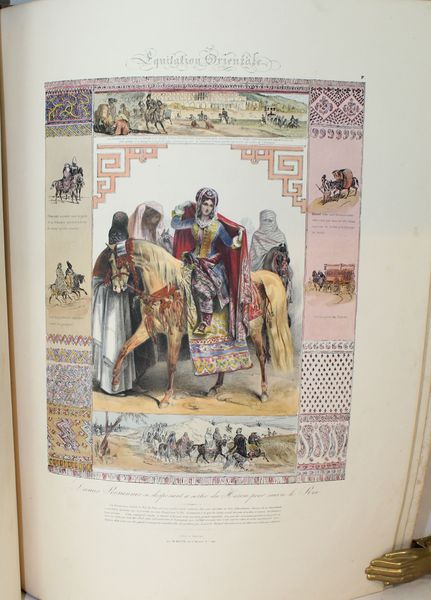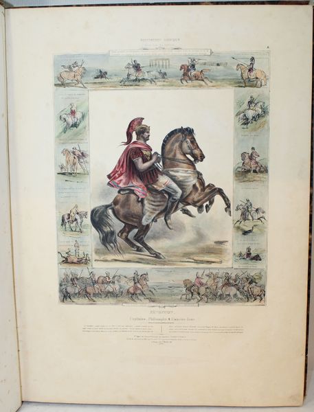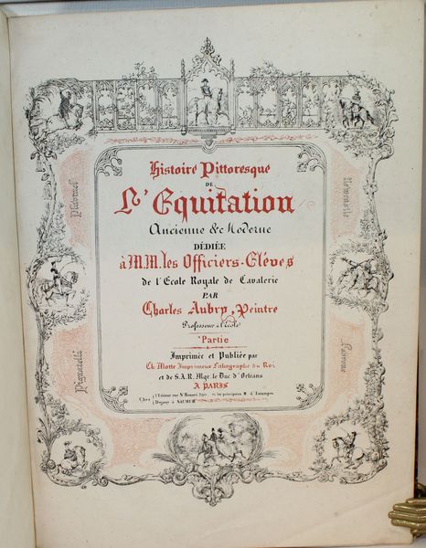 Rare ouvrage sur l'histoire de l'équitation dédiée à MM. Les Officiers Elèves de l'Ecole Royale de Cavalerie. Sont illlustrés les grands cavaliers, ex. par ordre chronologique : Xénophon...,Frédéric Grison, Pluvinel...,De la Guérinière...,Baron d'Eisenberg..., Mameluck.., Dames Persannes..., Pons d'Hostun, Mr Flandrin... etc. Unique édition, très rare, de ce bel album composé par le peintre et dessinateur Charles Aubry (1798-1841), dont le sujet de prédilection était le monde du cheval. Il faut dire que, très lié aux milieux militaires, il fut nommé en 1825 professeur de dessin à l’École de cavalerie de Saumur. Disposant sur place d’une presse lithographique, il s’en servit à la fois pour documenter les événements de l’École, produire des cours illustrés et des planches isolées. Il quitta Saumur en 1837. « L’histoire pittoresque de l’équitation est composée de 24 planches divisées en 2 parties. Chaque planche représente un des maîtres ou des cavaliers les plus célèbres. Autour de la figure principale qui occupe le milieu de l’estampe, viennent se placer diverses scènes de manège exécutées dans de petites proportions, lesquelles servent de complément et de développement à la scène principale et forment un encadrement pittoresque. Un texte court et précis se trouve au bas de chaque figure et indique les règles et principes de chaque maître, de chaque pays et de chaque époque. » Institut français du cheval et de l’équitation (IFCE) . Exceptionnel exemplaire colorié à la main. « Bel album in-f° lithographié. Dans quelques rares exemplaires, les planches sont coloriées. » Mennessier. Provenance : Ex-libris contrecollé gravé du Duc de Montebello : Ex Libris ducis Montebello. Fils aîné de Jean Lannes, 1er duc de Montebello (mortellement blessé à la bataille d'Essling), et de sa seconde épouse, Louise de Guéhéneuc, Napoléon Lannes fut fait pair de France à la seconde Restauration « en considération des services rendus par son père », mais il ne prit séance au Palais du Luxembourg qu'après la Révolution de 1830. |
