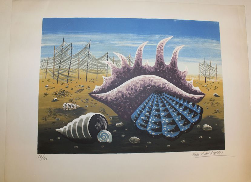 | Format : | Lithographie en couleurs représentant quelques coquillages sur le sable devant des filets de pêche, 630 x 475 mm, bon état. | |||||