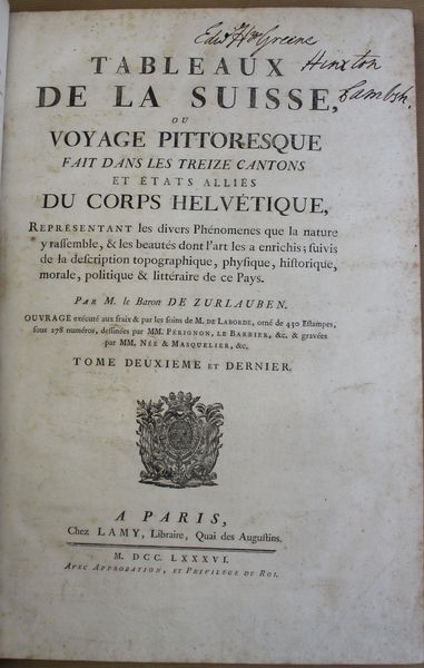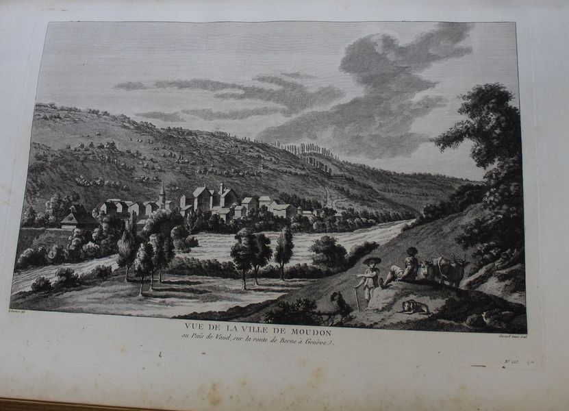 | Observations : | Tome III (sur 4) de cet ouvrage monumental, célèbre pour la qualité et l'abondance de ses planches. L'ouvrage complet doit comporter 2 tomes reliés parfois en 3, 4 ou 5 volumes avec les planches séparées, avec 430 Estampes sous 278 numéros représentant de magnifiques vues, cartes et portraits hors texte gravés par Née et Masquelier d'après Pérignon, Le Barbier, etc. Notre volume contient la première partie du Tome deuxième, celui-ci est tomé III au dos, il manque donc le Tome I (relié en 2 volumes, 366 - LXVI pp.) et la deuxième partie du Tome II (p. 363 à 578). Premier tirage de l'un des plus beaux livres illustrés sur la Suisse. L'ouvrage n'est pas moins intéressant par son texte : rédigé à la suite d'un véritable travail de collaboration entre spécialistes (Besson pour la minéralogie, Zurlauben pour l'histoire et le droit, Quétant, etc.), il offre pour l'époque la meilleure description des Cantons suisses, et aussi la plus renseignée en termes d'histoire et d'institutions. Sommaire : Etat des sciences et des arts - Moeurs des Suisses (Etats aristocratiques, démocratiques, helvétiques...) - Topographie , ( Canton de Zurich, Berne, Lucerne, Uri, Schweitz, Underwalden, Zoug, Glaris, Bâle, Fribourg ). Bel exemplaire en veau de l'époque. Provenance : De la bibliothèque E. H. Green Hinxton Cambridgeshire, avec ex-libris contrecollé et manuscrit. | |||||