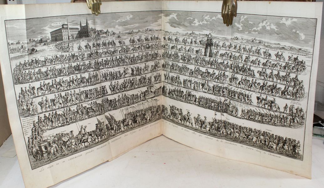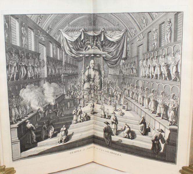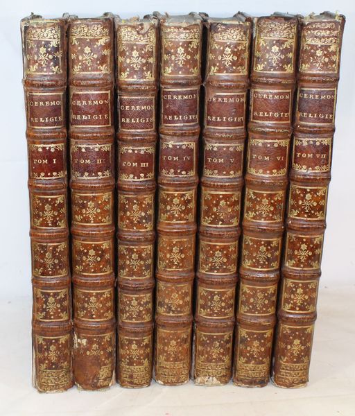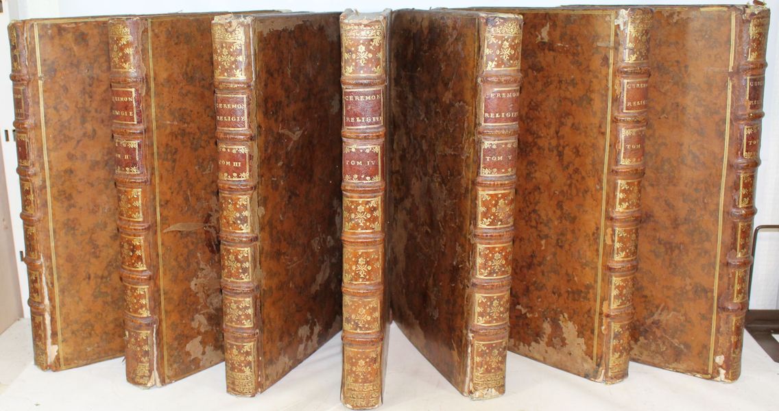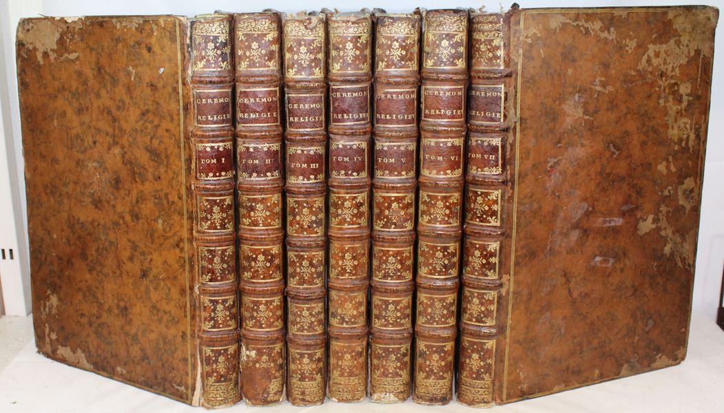 Sept volumes in-folio. Un frontispice (« Tableau des principales religions du monde »), daté de 1727, 227 planches, ainsi qu'un fleuron allégorique sur le titre, 96 vignettes et 31 culs-de-lampe, le tout gravé en taille-douce par Picart et Du Bourg. Bon état de fraicheur intérieure malgré de rares rousseurs, le feuillet de titre du T.I tâché, petite mouillure angulaire à quelques feuillets du T.III, manque angulaire à quelques feuillets du T.V sans perte de texte. Une planche reliée à l'envers au T.I. |