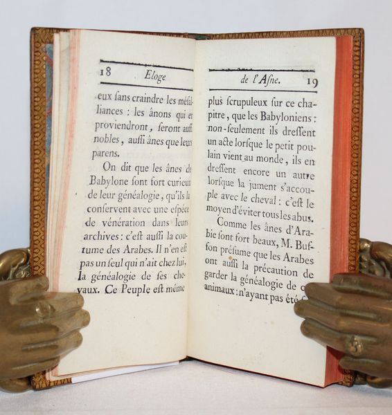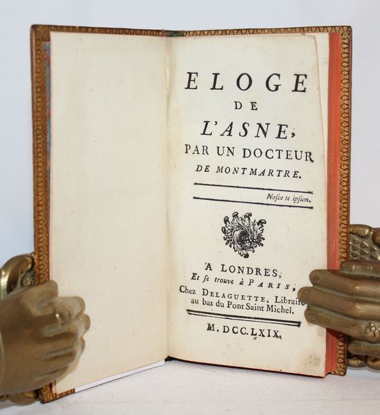 | Observations : | Érudite et amusante satire sociale attribuée à Dom Joseph Cajot (1726-1779), bénédictin de Saint-Vannes, connu pour ses attaques contre Rousseau qu'il accusait de plagier Plutarque et Montaigne. Dom Cajot publie sous le pseudonyme de docteur de Montmartre, en référence à l'Académie de Montmartre, « société fantastique » stigmatisant l'ignorance et la sottise. Le choix de l'âne qui se trouvait en grand nombre à travailler aux moulins de Montmartre, permet à l'auteur de prouver combien l'âne est à vanter au contraire de la masse des Parisiens-Babyloniens. | |||||