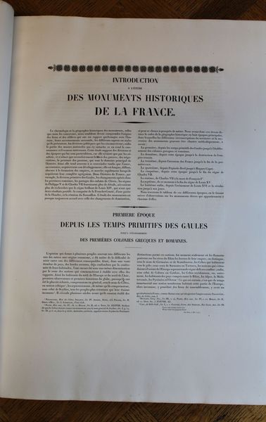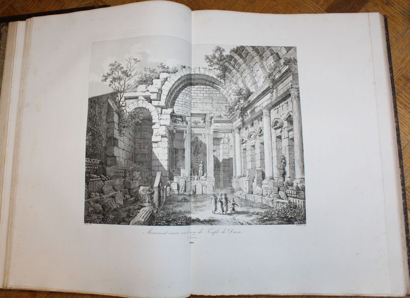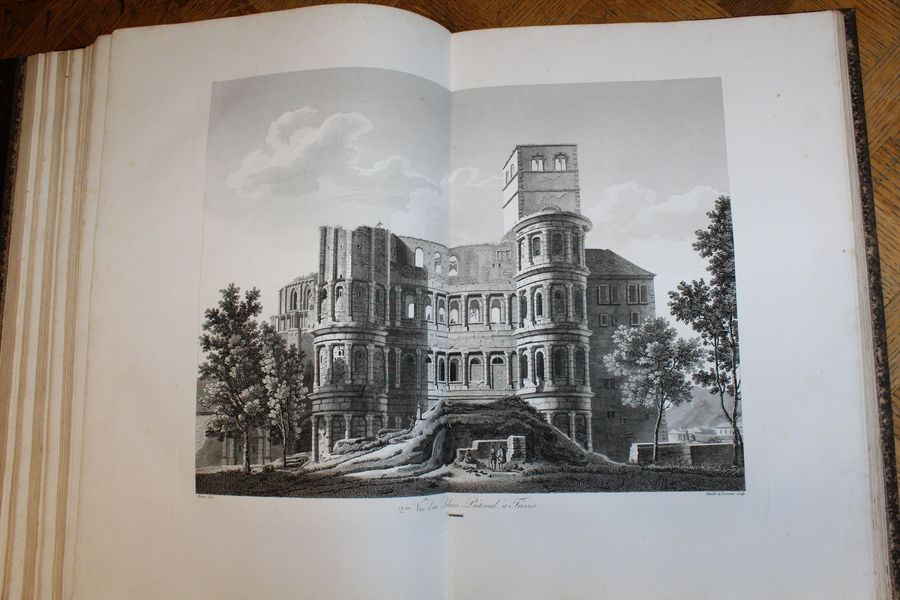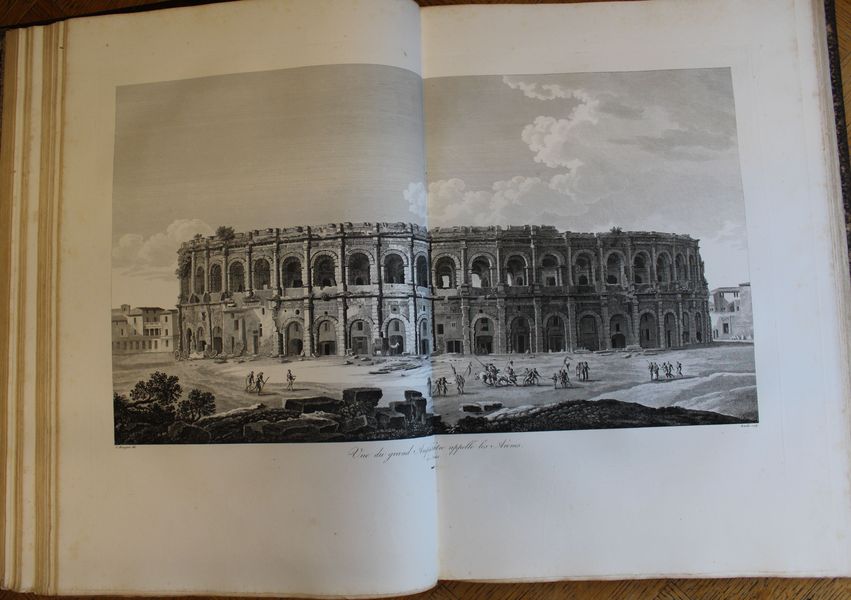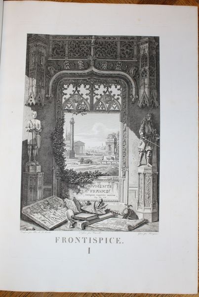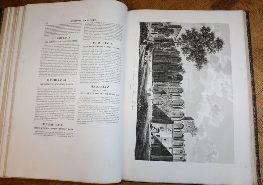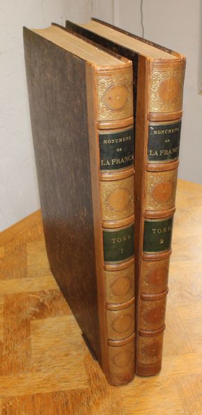 Rare édition originale magnifiquement illustrée. L'illustration se compose d'un frontispice et de 259 planches hors texte, dont 23 à double page, contenant plus de 300 sujets, lithographiées par Baltard, Réville, Malbeste, d'après les dessins de Constant Bourgeois, Nicolas Chapuy et Bance, qui avaient consacré plusieurs années à parcourir la France et qui devinrent, après 1820, les artisans des grands recueils lithographiques. «L'héritage de tous les siècles» se trouve ici rassemblé, l'auteur voulant montrer que la France est, de toutes les contrées, la plus riche en monuments de tous les âges. Tiré de l'avant propos Dans le premier volume, nous avons décrit la plus grande partie des monuments celtiques et romains... Second volume doit contenir la description des édifices civils et religieux élevés sous le règne de nos Rois...Nous y avons signalés trois genres d'architecture.. Style roman ou à plein-cintre, appelé indistinctment saxon ou lombard ; le style ogivique, dit improprment gothique ou arabesque, et le style de la renaissance. Précieuse édition de cet important ouvrage illustrant de la plus belle des manières les monuments des villes de Sens, Joigny, Vézelay, Cavaillon, Vienne, Fréjus, Aix, Reims, Avignon, Bordeaux, Toulouse, Autun, Toul, Lyon, Chartres, Paris, Tours… (la planche 184 se trouve sur la planche 180) |