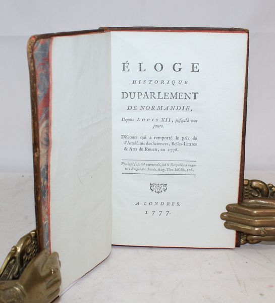 | Observations : | Discours qui a remporté le prix de l'Académie des Sciences, Belles-Lettres et Arts de Rouen en 1776. Exemplaire aux armes du baron Le Roux d'Esneval et d'Acquigny, conseiller au Parlement de Rouen en 1767 et président à mortier au même parlement en 1770. Très bel exemplaire. | |||||