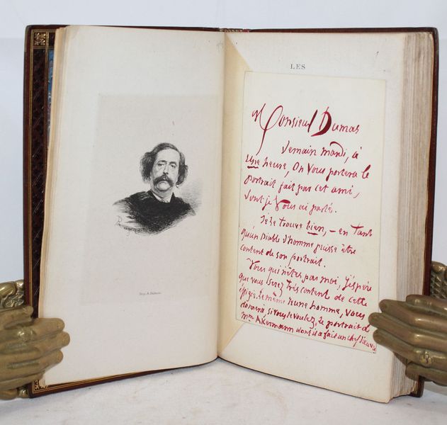 | Format : | In-12. Parfait état intérieur, belles marges (182x 115 mm). Enrichi d'un portrait par Rajon sur chine et d'un carton manuscrit à l'encre rouge de l'auteur envoyé à Monsieur Dumas à propos de son portrait qui va lui être livré Je le trouve bien, autant qu'un Diable d'homme puisse être content de son portrait...le même jeune homme vous donnera, si vous le voulez, le portrait de Mme Ackermann dont il a fait un chef-d'oeuvre. Ex-libris manuscrit Bibliothèque de feu M. Léon Manchon, membre de la Société des amis des livres, des Cent bibliophiles, etc....(Drouot, 1911). | |||||