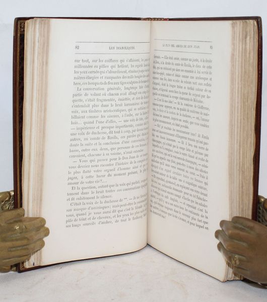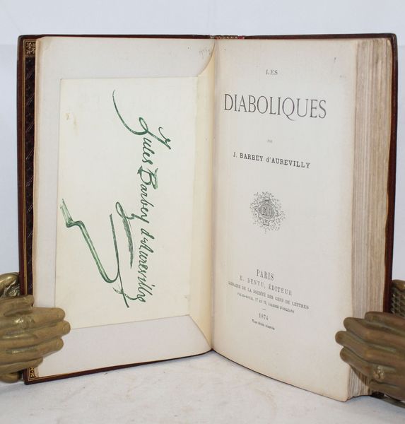 | Observations : | Très bel exemplaire de cette édition originale devenue rare, avec sa couverture au bandeau rouge sans mention d'édition et avec toutes les coquilles carractéristiques de la première émission (p. 15, l.6: vnos; p. 25, l2: seulemen,t; p. 121, l11: s'enrudir; p. 124, l7: lui; p. 186, l10: Hartfort; p. 311, l24 & 25: lui et qu'il; p. 322, l1: produite). Suite à une poursuite par le Parquet de la Seine, l'ouvrage fut d'abord interdit, puis autorisé en 1875. Sur un tirage de 2200 exemplaires, 480 exemplaires qui se trouvaient chez le brocheur furent quand même détruits, avec le consentement de Barbey. A leur parution, Les Diaboliques, considérées comme l'oeuvre la plus célèbre de l'auteur, firent grand bruit de par leur originalité, leur titre et le scandale qu'elles soulevèrent. L'écrivain les rédigea dans la période la plus sombre de sa vie, entre 1863 et 1873, après sa rupture avec Trébutien en 1858 et l'échec de son projet de mariage en 1860. Très bel exemplaire parfaitement relié par Gruel et enrichi d'un portrait et d'un mot manuscrit d el'auteur à propos d'un de ses portraits. | |||||