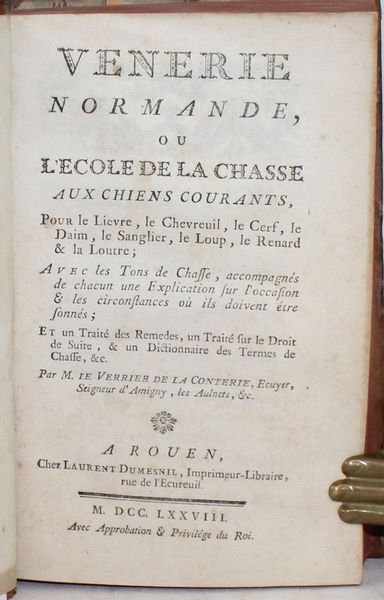 | Titre : | Vénerie normande ou L'école de la chasse aux chiens courants, pour le Lièvre, le Chevreuil, le Cerf, le Daim, le Sanglier, le Loup, le Renard & la Loutre; avec les Tons de Chasse.... Et un Traité des Remèdes, un Traité sur le Droit de Suite, & un Dictionnaire des Termes de Chasse, &tc. | |||||