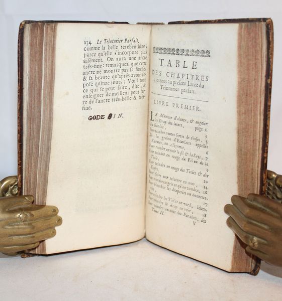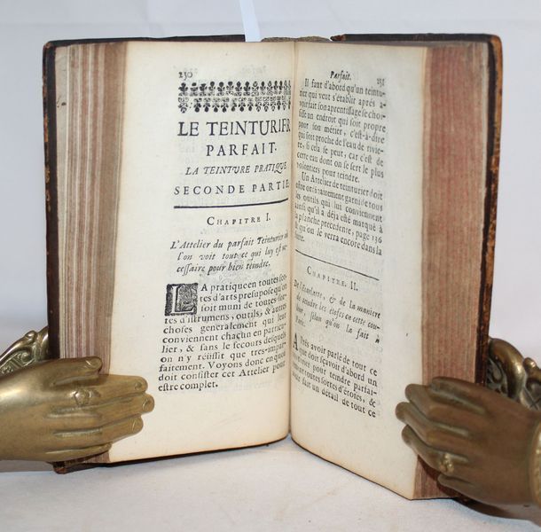 Le Teinturier parfait ou l'art de teindre les soyes, laines, fils, chapeaux, &c. La manière de mettre en couleur les cuirs, l'Yvoire, les Os, le Bois, Le Verre, le Criftal, &c. Suivi de: Suite du teinturier parfait, ou l'Art de teindre les Laines, Soyes, Fils, Peaux, Poils, Plumes, &c. Comme il se pratique à Venise, Gennes, Florence, & dans tout le Levant... |