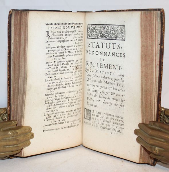 Deux volumes in-12. Tome Ier comprenant deux parties: (12)ff., 543 pp.; tome second constituant la troisième partie aditionnée des Statuts: (2)ff;, 234 pp., (7)ff. de table; 187 pp. (Statuts, Ordonnances et Reglements), (4)pp. Provenance: jean Jacob Godebin, 1722 (manuscrit sur le titre) et Séminaire du Mont aux Malades (Rouen, cachet p. 33). |