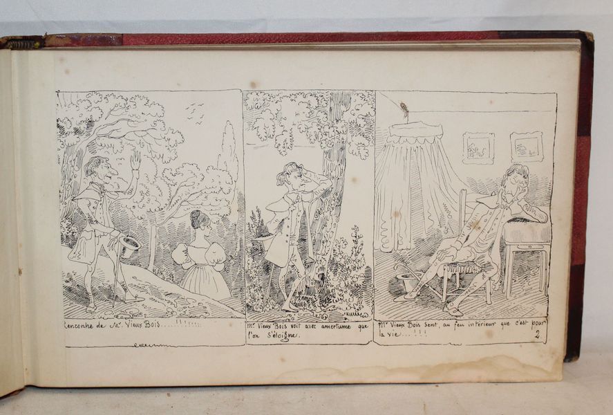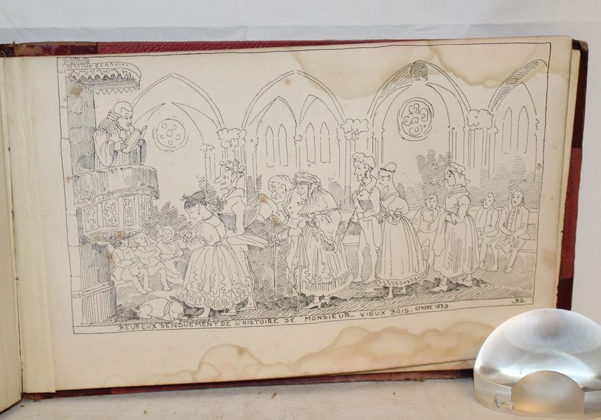 | Observations : | Livre illustré par Topffer. Complet de ses planches. IL est aujourd'hui considéré comme la première bande dessinée connue. Dessiné en 1827 mais autographié et publié en 1837. Sur la page de titre on peut lire cette préface: « Ci-derrière commence l’histoire de monsieur VieuxBois, et comme quoi après bien des vicissitudes, il épouse l’Objet aimé. Va, petit livre, et choisis ton monde ; car aux choses folles qui ne rit pas baille ; qui ne se livre pas résiste ; qui raisonne se méprend, et qui veut rester grave, en est maître. » | |||||