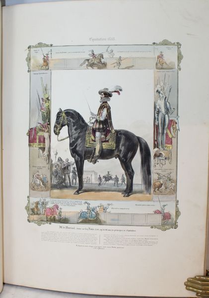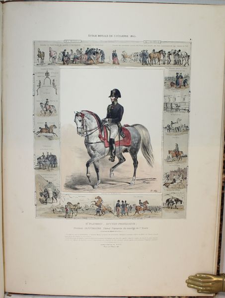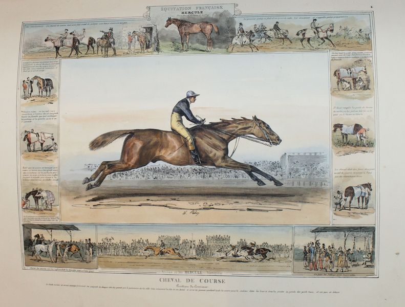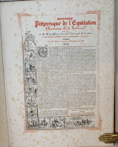 Rare ouvrage sur l'histoire de l'équitation dédiée à MM. Les Officiers Elèves de l'Ecole Royale de Cavalerie. Sont illlustrés les grands cavaliers, ex. par ordre chronologique : Xénophon...,Frédéric Grison, Pluvinel...,De la Guérinière...,Baron d'Eisenberg..., Mameluck.., Dames Persannes..., Pons d'Hostun, Mr Flandrin... etc. Unique édition, très rare, de ce bel album composé par le peintre et dessinateur Charles Aubry (1798-1841), dont le sujet de prédilection était le monde du cheval. Il faut dire que, très lié aux milieux militaires, il fut nommé en 1825 professeur de dessin à l’École de cavalerie de Saumur. Disposant sur place d’une presse lithographique, il s’en servit à la fois pour documenter les événements de l’École, produire des cours illustrés et des planches isolées. Il quitta Saumur en 1837. « L’histoire pittoresque de l’équitation est composée de 24 planches divisées en 2 parties. Chaque planche représente un des maîtres ou des cavaliers les plus célèbres. Autour de la figure principale qui occupe le milieu de l’estampe, viennent se placer diverses scènes de manège exécutées dans de petites proportions, lesquelles servent de complément et de développement à la scène principale et forment un encadrement pittoresque. Un texte court et précis se trouve au bas de chaque figure et indique les règles et principes de chaque maître, de chaque pays et de chaque époque. » Institut français du cheval et de l’équitation (IFCE) . Exceptionnel exemplaire colorié à la main. « Bel album in-f° lithographié. Dans quelques rares exemplaires, les planches sont coloriées. » Mennessier. Provenance : Ex-libris contrecollé gravé du Duc de Montebello : Ex Libris ducis Montebello. Fils aîné de Jean Lannes, 1er duc de Montebello (mortellement blessé à la bataille d'Essling), et de sa seconde épouse, Louise de Guéhéneuc, Napoléon Lannes fut fait pair de France à la seconde Restauration « en considération des services rendus par son père », mais il ne prit séance au Palais du Luxembourg qu'après la Révolution de 1830. |