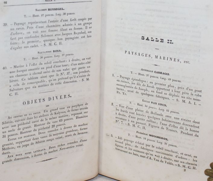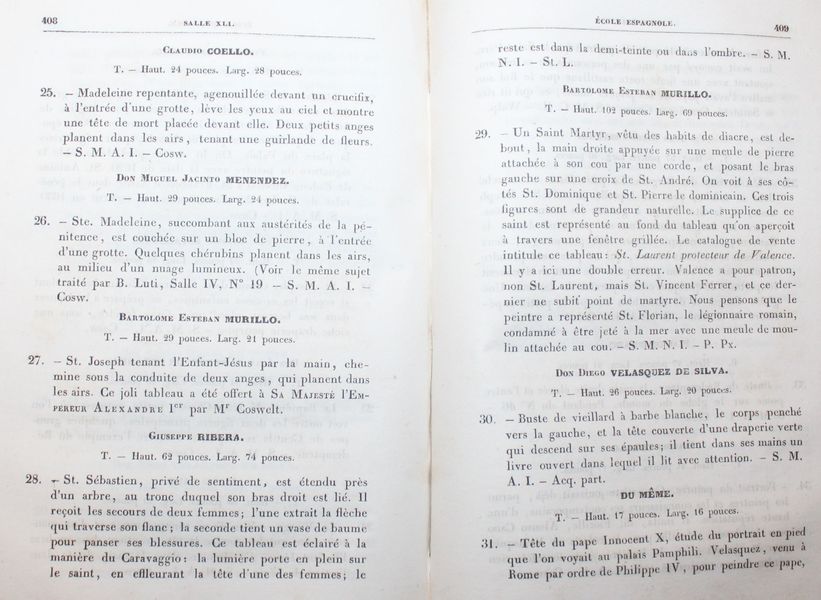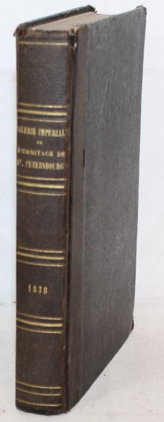 Le Musée d'État de l'Ermitage (en russe Gosudarstvenny Ermitazh) fut fondé en 1764 par Catherine II, qui voulut symboliser par une collection prestigieuse la grandeur de la Russie. Dans un souci de rapprochement avec l'Europe, l'impératrice avait acquis des collections entières (Gotzkowski, 1764 ; Brühl, 1769 ; Crozat, 1772, etc.). Elle fit construire de 1764 à 1775 le pavillon du Petit Ermitage, attenant au palais d'Hiver, résidence des tsars de Russie (érigé entre 1754 et 1762), afin d'y exposer ses tableaux, instaurant ainsi une galerie privée réservée à l'usage de la cour. Le palais d'Hiver, incendié en 1837, fut reconstruit sous Nicolas Ier, de 1840 à 1852 ; le musée proprement dit, épargné par les flammes, ouvrit ses portes au public à la fin des travaux. Après la révolution d'Octobre 1917, les collections impériales devinrent la propriété de l'État. Le complexe de l'Ermitage réunit aujourd'hui cinq édifices reliés entre eux, comprenant le palais d'Hiver, le Petit Ermitage, l'Ancien Ermitage (dit Grand Ermitage, construit de 1771 à 1787), le Nouvel Ermitage (inauguré en 1852) et le théâtre (édifié de 1783 à 1787). Le premier guide officiel et détaillé des collections paraît à Saint-Pétersbourg en 1838: ce Livret de la Galerie impériale de l’Ermitage de Saint-Pétersbourg nous offre un état des lieux avant travaux. Il nous permet d’appréhender à la fois l’apport de la France à la constitution et à la mise en valeur des collections durant la première période de son histoire et, complété par l’étude de divers documents d’archives conservés au musée d’État de l’Ermitage, il nous éclaire plus précisément sur les motivations esthétiques, voire politiques, des grandes acquisitions réalisées en France au début du XIXe siècle. Des motivations qui transparaissent jusque dans l’agencement des salles d’exposition de ces derniers achats, dans cet Ermitage impérial d’avant sa reconstruction. Le Livret de 1838 est édité sous l’autorité du directeur de la galerie de l’Ermitage, François Xavier Labensky (1769-1850), qui commença sa carrière en ces lieux sous Paul Ier. Il propose principalement une visite détaillée, salle par salle, des galeries, avec des descriptions complètes de chaque tableau. Le catalogue s'ouvre sur un bref aperçu historique et comprend un index, témoignant de sa rigueur scientifique. On remarque notamment une grande carte dépliante et un tableau en fin d'ouvrage présentant le nombre d'artistes et de tableaux, classés par école nationale et détaillant les acquisitions réalisées par chacun des quatre monarques (Catherine la Grande, Paul Ier, Alexandre Ier et Nicolas Ier) qui ont enrichi la collection. Ce tableau révèle que sur les 1 692 tableaux que comptait l'Ermitage en 1838, une part importante (1 385) a été acquise par Catherine la Grande. |