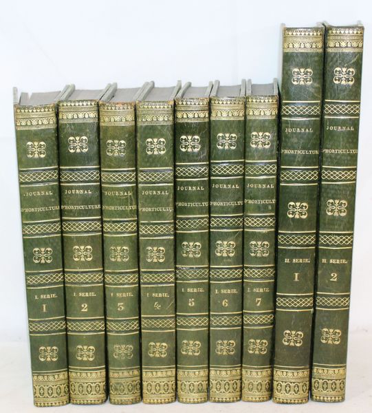 | Reliure : | Très agréables reliures homogènes en demi-veau vert foncé à coins, roulette dorée sur les plats, dos lisse très orné de filets, larges roulettes et fleurons dorés. Papier des plats d'un joli vert plus clair, et tranches bleutées. Très bon état pour cette | |||||